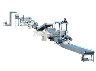 花生米自動油炸生產(chǎn)線的主要設(shè)備:提升機、燙漬機、脫皮機、揀選帶、晾干帶、油炸機、脫油機、拌料機。